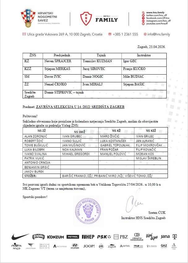 Poziv za Završnu selekciju Središta Zagreb U-14(2012.)